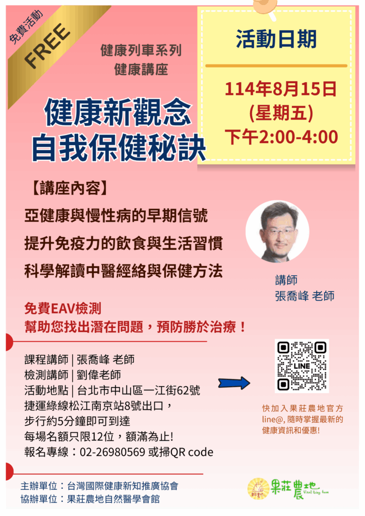 果莊朋友們大家好,8月第三週「健康列車」_EAV健康狀況掃描檢測,訂定 8/15(週五)在果莊農地自然醫學會館舉辦,細節如下: